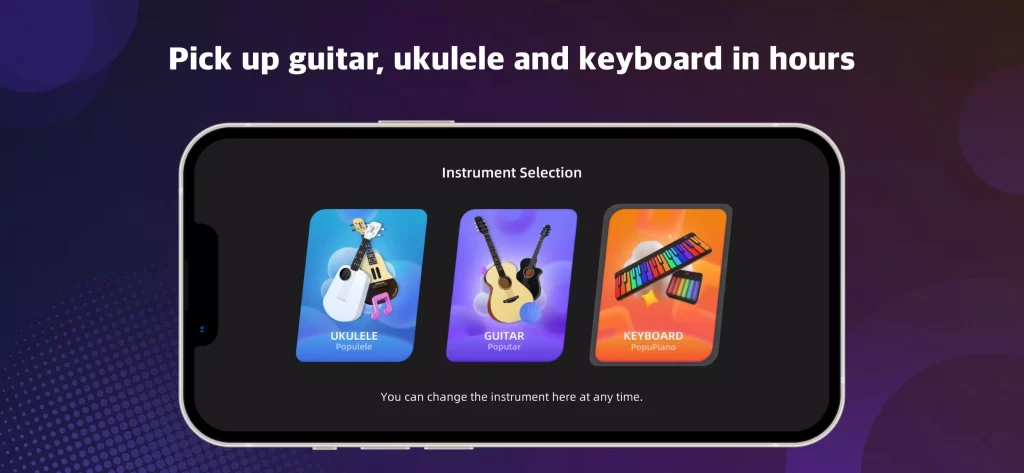 PopuMusic là một app đa chức năng nơi bạn có thể sử dụng cho nhiều mục đích khác nhau, bao gồm việc học trên từng nhạc cụ riêng biệt bao gồm: