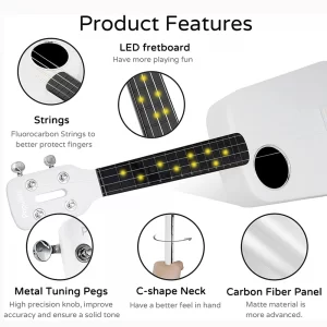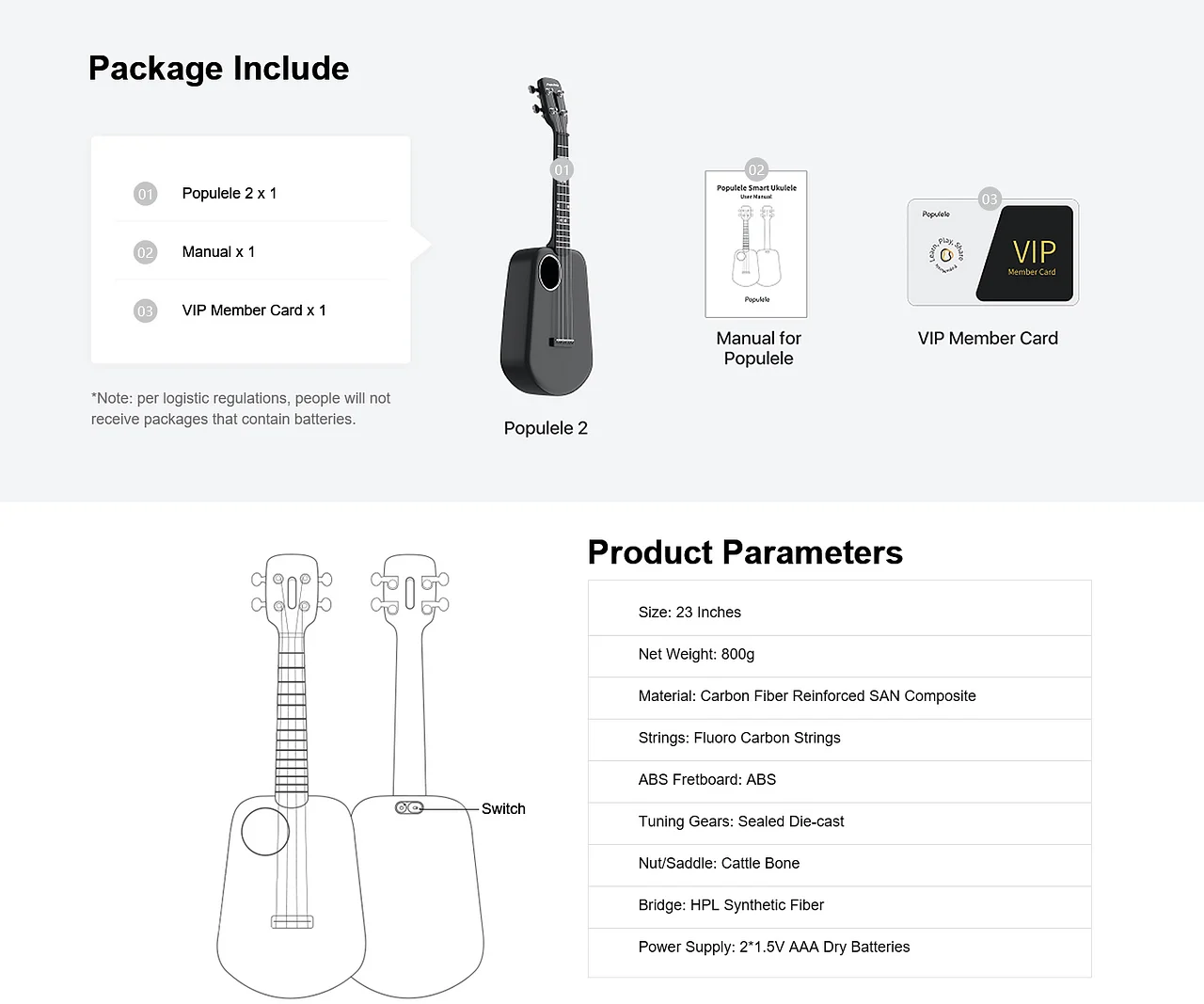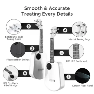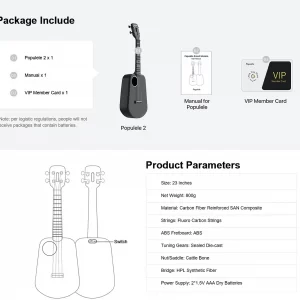 - Đến từng chi tiết – Pin khô bền, thân thiện với môi trường, kiểm soát mức tiêu thụ điện năng tối ưu, thay pin dễ dàng, mang đến cho bạn một cây đàn ukulele ngắn gọn và hoạt động tốt;