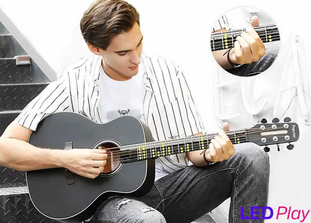 Tất nhiên, Poputar có một điểm nổi bật so với đàn guitar thông thường là hệ thống đèn sáng hướng dẫn vị trí hợp âm, nên người học không cần thiết phải ghi nhớ. Người học chỉ việc nhìn vào đèn hoặc nhìn trên app PopuMusic là có thể biết được hợp âm mình cần chơi sẽ phải bấm như thế nào.